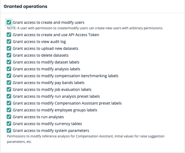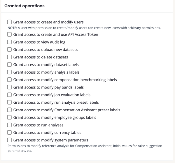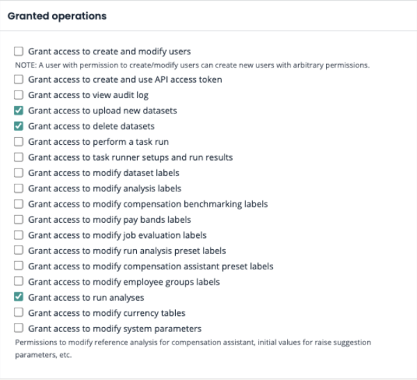 Granted operations: focus on the actions a user can perform. This includes user management, label management, data set management, as well as the use of analyses and task runner actions.
