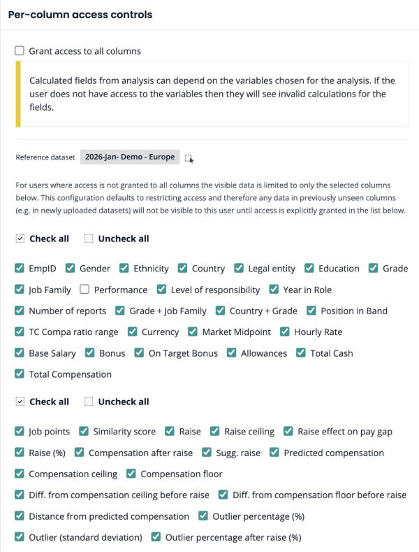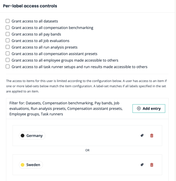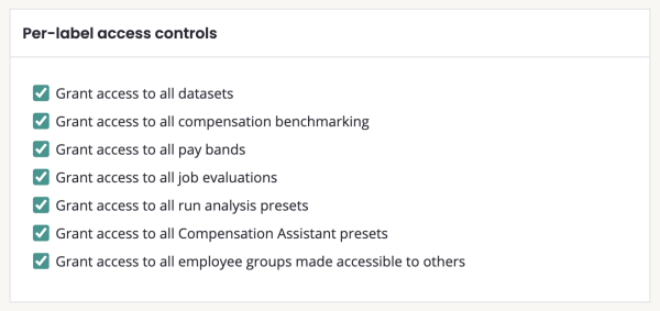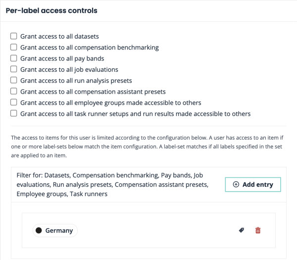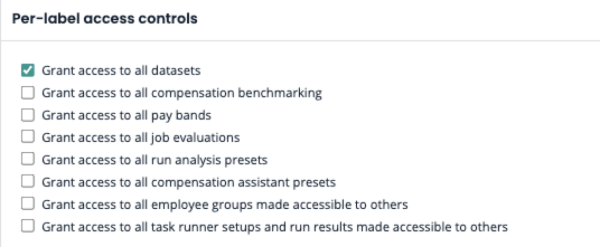 Per-label access controls: limits access to data with labels. Provides access only to datasets, presets, Compensation assistant and benchmarking to which the label(s) that the user has access to are applied.