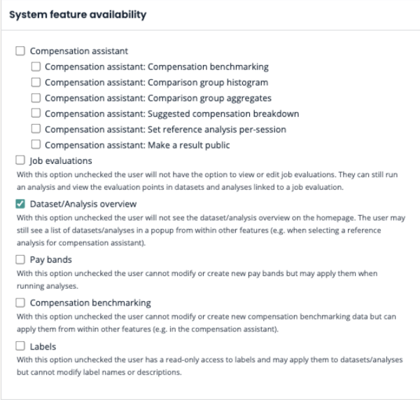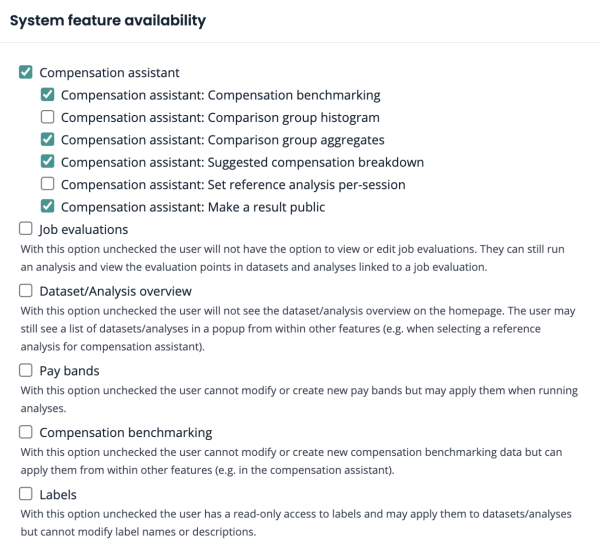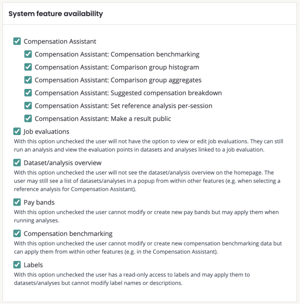 System feature availability: focused on features that a user can see. This provides access to full features, including Compensation assistant, Job evaluation, Pay equity analysis, Pay bands and Labels.
