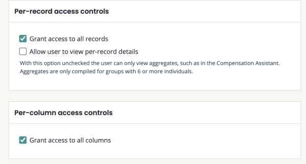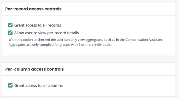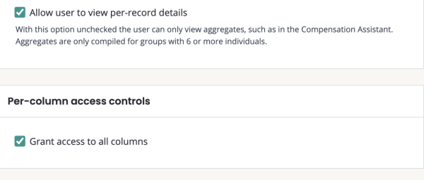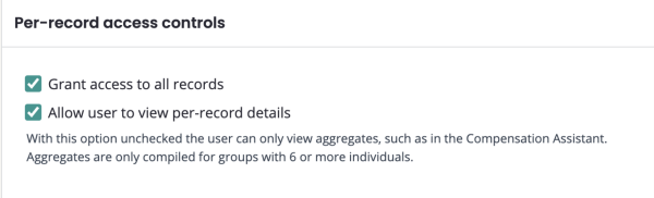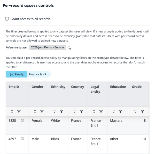 Per-record access controls: limits access to specific employees within a dataset. Provides access only to groups of employees within a dataset, but not to full datasets or analysis results.