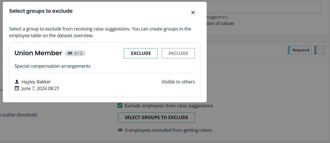 Excluding groups from raise suggestions means that the optimization model will run across all other employees and suggest raises to achieve your pay equity goals. Raise suggestions for the exclusion group will always be zero (0).