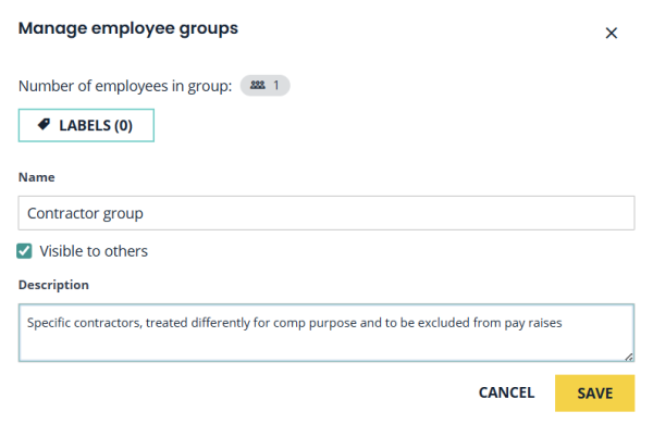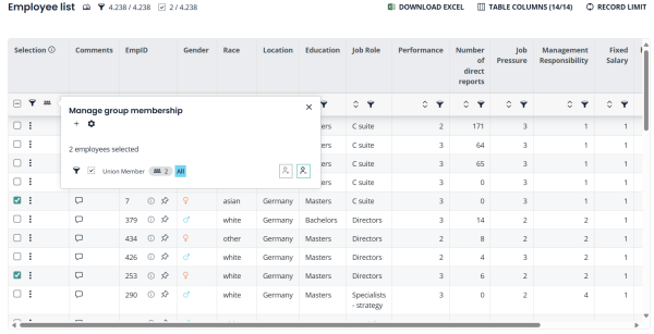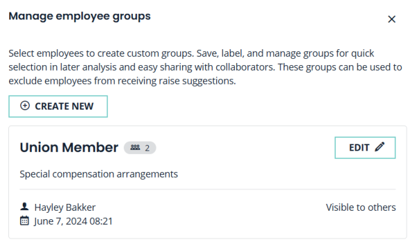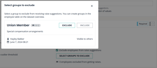 Employee groups are a way of grouping a set of employees based on criteria different than the ones available in your dataset. It may be used for further analysis of a certain group, to exclude groups for example from raises, or to share a group with collaborators.