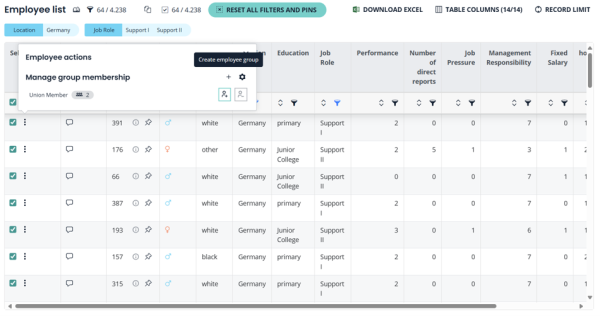 In any of the above situations, you can create an Employee Group and make it visible for other users in the future to investigate, quick-select, filter and analyze these groups in more detail.