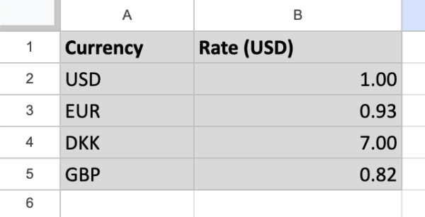 Uploaded Excel file: the selected primary currency is set to a value of 1, with the exchange rates for the other currencies defined relative to this primary currency.