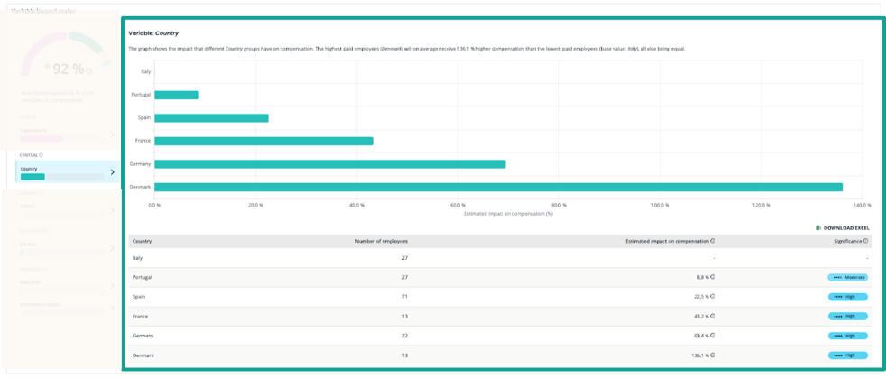 The categories below are presented in order of increasing positive impact on compensation, based on your compensation model (for instance, "working in Denmark" leads to the greatest increasing impact on compensation, compared to the baseline "Italy"). This means that an employee in the second category (such as Portugal) according to your compensation model would, on average, receive a 9% higher compensation compared to the baseline category (Italy in our example), assuming that all other compensation drivers are equal.