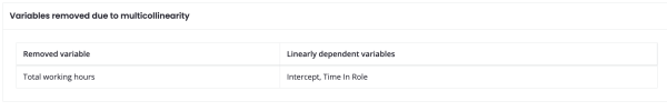 This strong correlation can lead to model instability, making it necessary to remove one of the highly correlated variables from the regression analysis. If your data exhibits perfectly correlated variables, you will find an additional table indicating which variables were removed due to multicollinearity, as shown in the following picture: