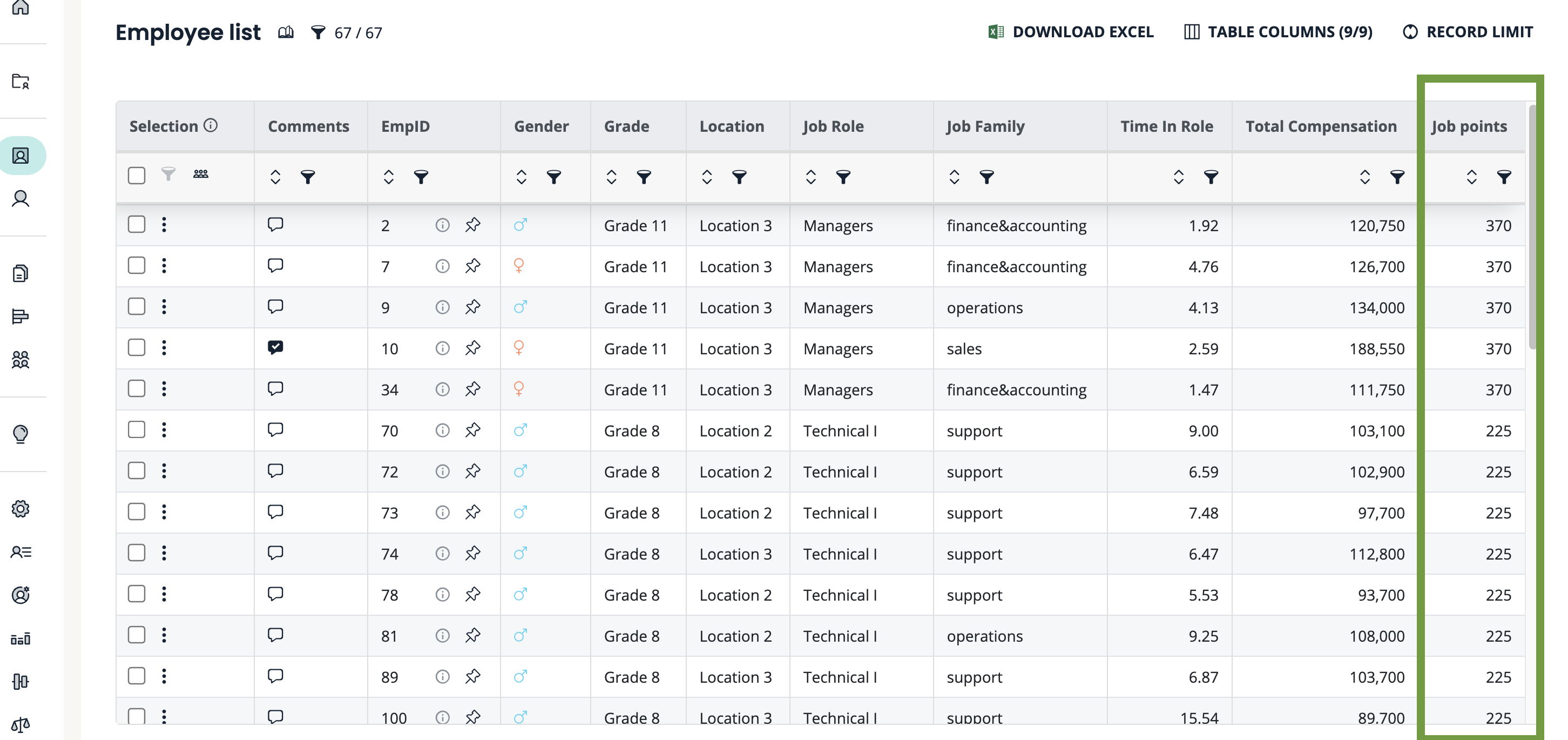 If your evaluation includes evaluation factors for employee attributes, PayAnalytics presents a column with the total points by default, but you may see the columns for both job points and employee points if you wish.