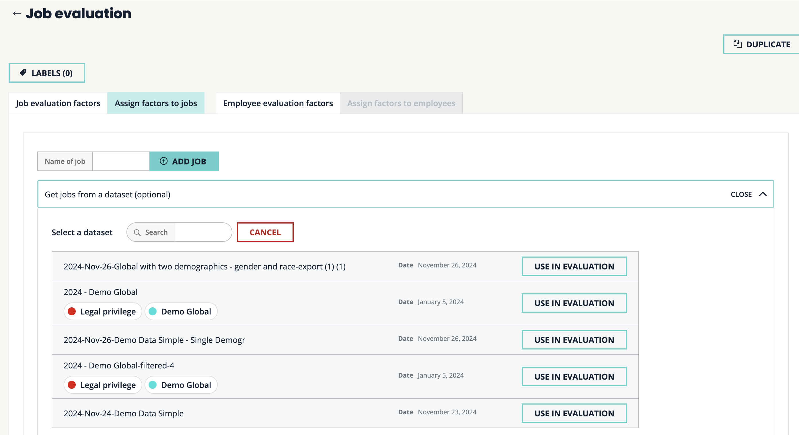 Once all jobs are evaluated in the Job Evaluation feature, you can use the PayAnalyticsValue-based comparison feature. For further information on how to conduct equal pay for work of equal value comparison, Value-based comparison feature see article.