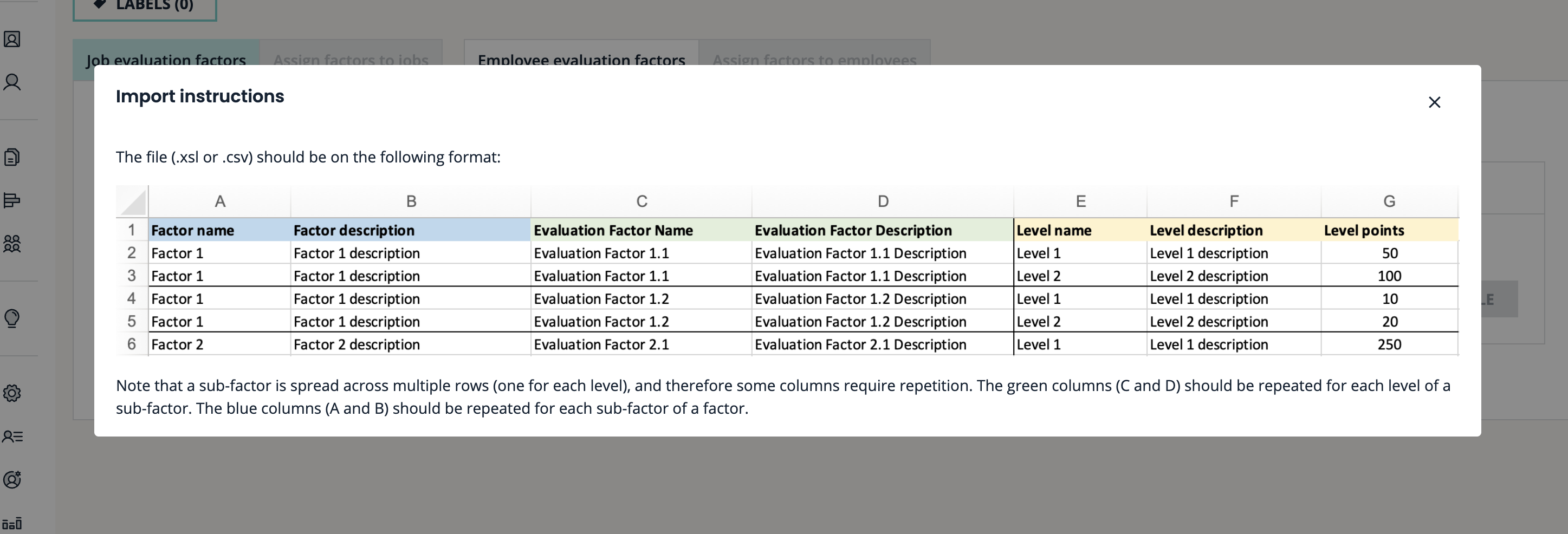 Importing your own template - for organizations with established evaluation criteria stored in a spreadsheet format, importing an Excel file can save time and allow for seamless integration. PayAnalytics will map the data fields, making it easy to upload criteria that align with the organization’s existing evaluation structure. The Import instructions window is presented in the following figure: