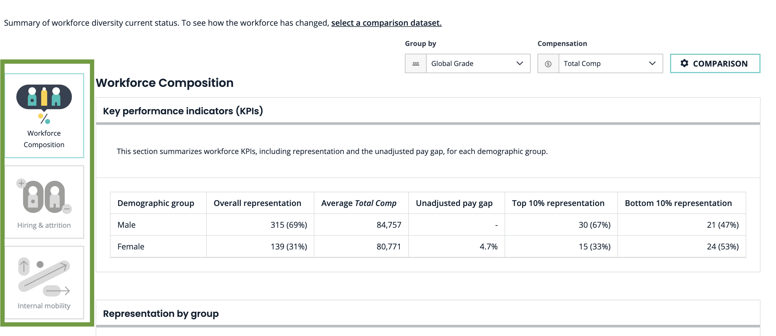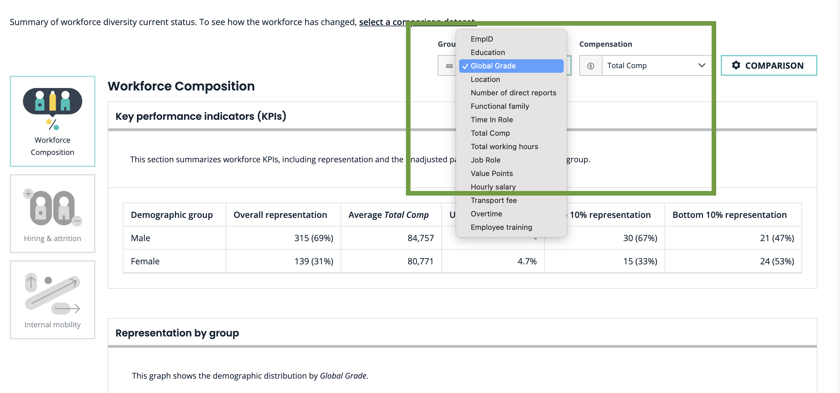 By clicking on Comparison button and selecting a dataset to use for comparison, you will enable the Hiring & attrition and Internal mobility features, as the following figure illustrates:
