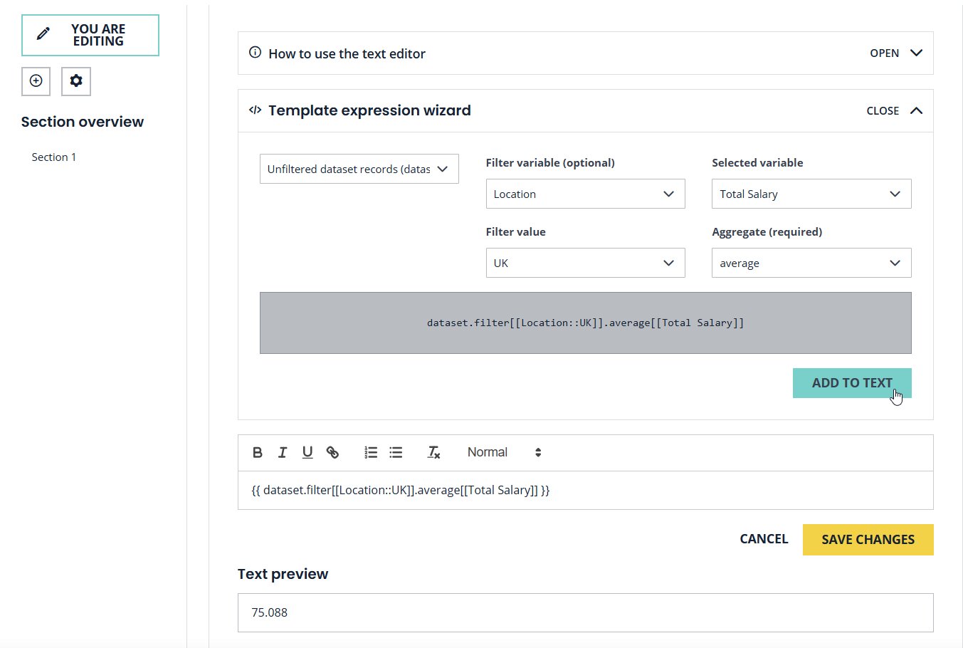 Once you have completed the expression wizard, click Add to text to automatically copy the calculation into your text field. Preview the expression within your text to ensure it is a valid and meaningful expression. Click Save Changes to close the creation process.