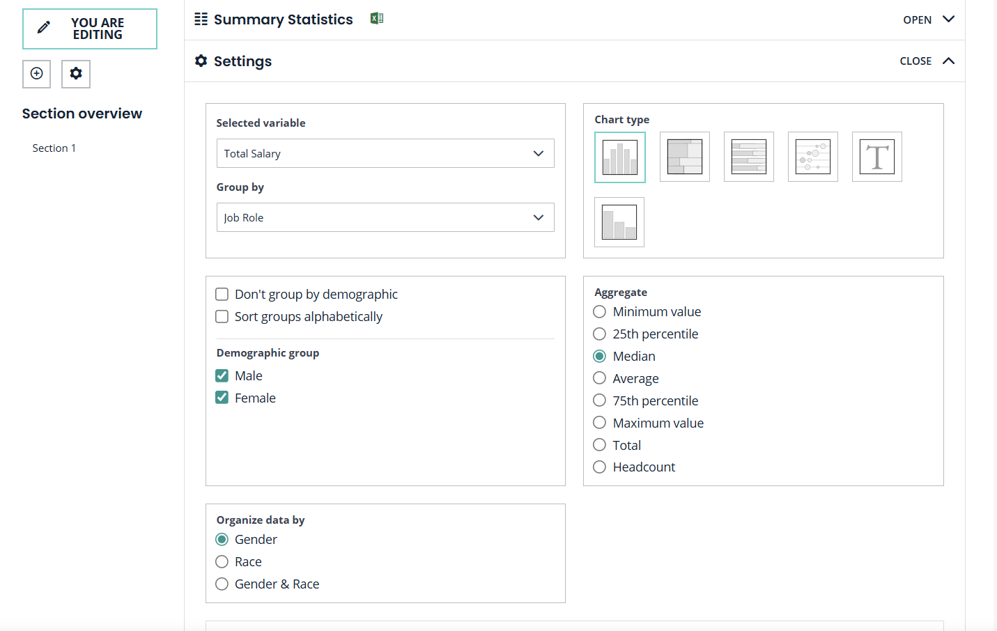 Selected variable - the data columns (numerical variable) you would like to perform the calculation on, e.g. total salary, value points, or adjusted pay gap.