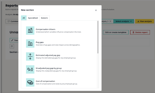 Sections are divided into specialized and more generic graphics. The specialized sections come predefined with key information based on the pay equity analysis, while the generic sections can be customized to generate graphs and visualize data, both from the raw dataset and the analysis results.