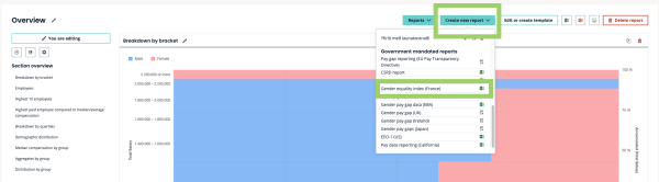 Once the Report section has been opened, click on Create new report, and scroll down until you find the Gender equality index (France) report in the Government mandated reports, as illustrated on the following picture: