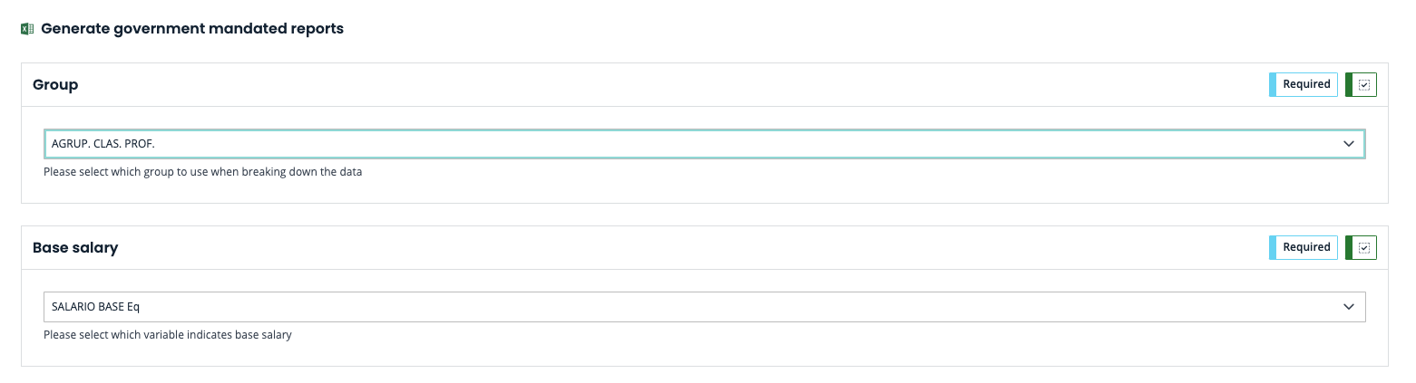 You will be redirected to the report configuration page, where you'll first need to select the groups to break down the data and categorize your employees by professional classification and select your base salary, as shown on the following illustration: