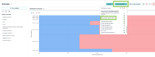 When you have uploaded your dataset with the necessary fields, you select the dataset and navigate to the Report section in the left navigation bar. Then you click, Create new report, and under Government mandated reports you select the Remuneration register (Spain), as presented on the following picutre: