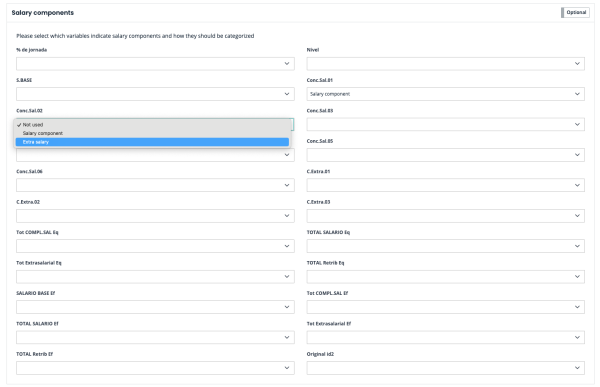The next step is to identify the variables in your dataset that correspond to salary components, distinguishing between ordinary salary components and extraordinary ones. While all variables in the dataset will be presented for selection, you only need to focus on selecting those related to salary components. The example is illustrated on the following picture: