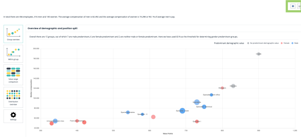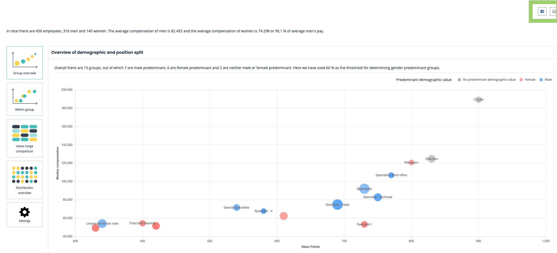 For example, in the first graph/chapter, you'll see an overview of the job groups, where you can analyze the job roles and compare the median salary to other roles with similar value points. The graph also provides information on whether the job roles are predominantly male or female-dominated, as illustrated on the following picture: