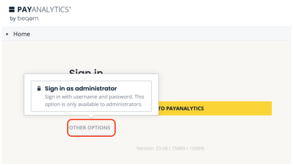 Log into your PayAnalytics instance via "Other Options" -> "Sign in as administrator" (see Figure 4.1). If OIDC has not yet been enabled then the login form can be used directly. If you're logging in for the first time you will need to retrieve your password with the "Forgot Password" feature.
