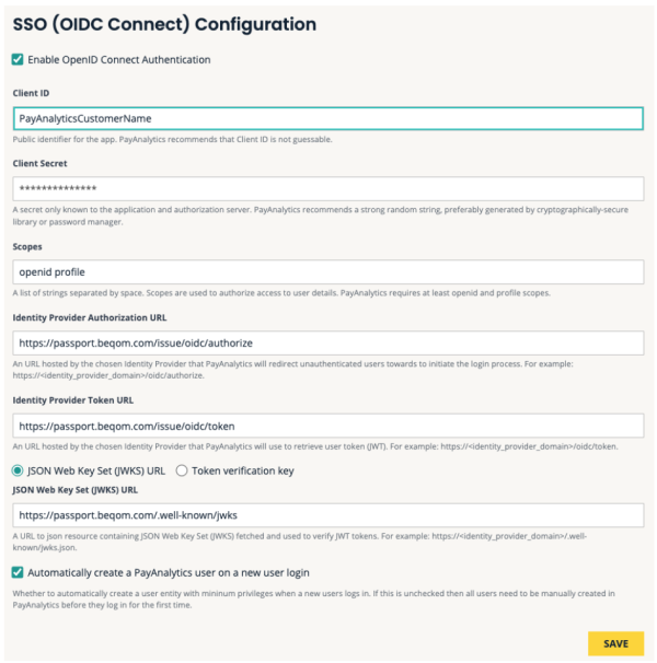 Configuring PayAnalytics SSO/OIDC against customer authentication system