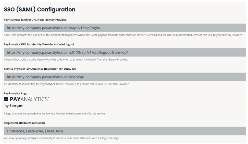 The SP metadata is available on the following url: https://my-company.payanalytics.com/api/v1/sso/metadata