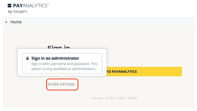 PayAnalytics system owner: Log into your PayAnalytics instance via "Other Options" -> "Sign in as administrator" (see Figure 4.1). If you're logging in for the first time you will need to retrieve your password with the "Forgot Password" feature.