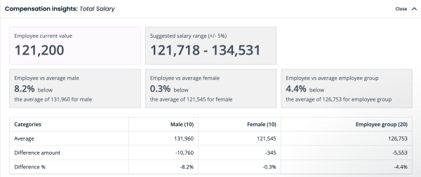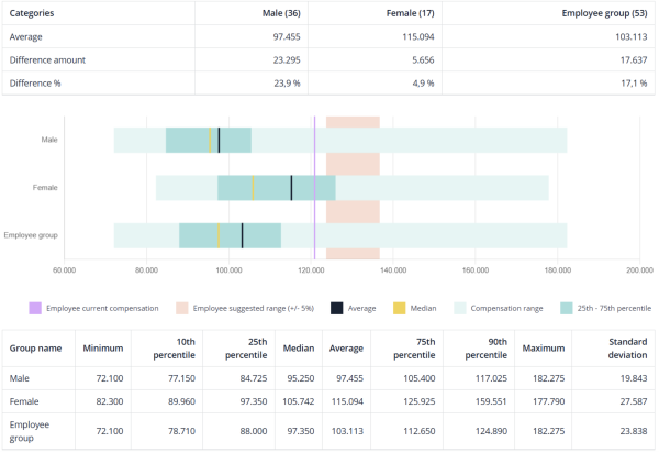 Employee vs avg. male: compares the current compensation of the employee with the average compensation of male employees within the selected employee group. Here, the male group is considered the baseline and the percentage difference of the employee is displayed.