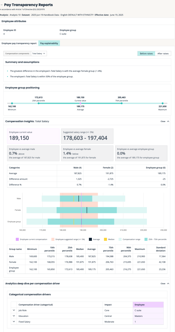 The raise toggle: if raise suggestions were enabled in the original analysis, then this toggle enables you to view the data before and after raises. Keep in mind that for both the Before raises and After raises views, the data of the entire employee group is taken into account. Therefore, values such as the difference percentages, the averages and the percentile values are impacted. In the After raises you will see the positioning of the employee compared to the other employees in the group after compensation adjustments are applied to all the employees.