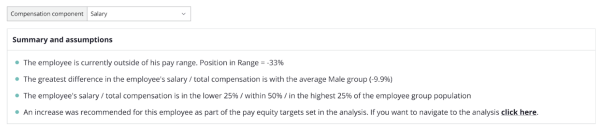 The Summary and assumptions section offers a textual overview that summarizes the position of the employee's compensation in comparison to their group, highlighting the areas with the greatest differences and indicating any risk areas. In addition, if raise suggestions were included in the pay equity analysis, this section also indicates whether any raise was suggested for the employee.