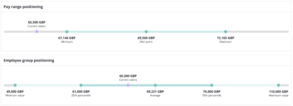 The pay range positioning rail displays the employee's current salary represented by a purple dot, and the employee's salary compared to the pay bands. The range is represented in light blue on the rail; with the minimum, mid-point and maximum values represented by blue dots on the rail. If the employee is positioned below or above the pay band, this may warrant an explanation and could indicate an area for remediation.