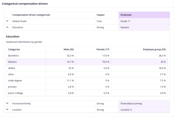In the following example, education strongly impacts compensation within the organization. The specific employee in this example has a Masters degree (employee value is highlighted in light purple) which appears to be the highest level of education. A high percentage of employees within the category of worker have a masters degree (34%), however the greatest number of employees have a lower level of education (67%). Assuming that a higher level of education positively impacts compensation, this could not explain the employees lower compensation compared to their group. In fact, a higher level of compensation would be expected.