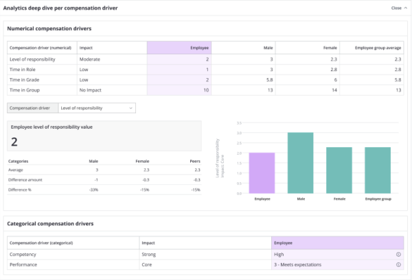 The Analytics breakdown by compensation driver section provides deeper insights into the specific compensation drivers (or variables), broken down by categorical and numerical, used in the compensation model and how the specific employees' values compare to those of peers in their employee group. In case pay differences between the employee and their peer group are driven by compensation drivers, these insights may help justify or explain these differences to the employee.