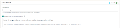 For usage in the Employee pay transparency report, check Use additional compensation settings and choose the relevant elements to include, usually a form of base salary, variable, benefits, and hourly pay. Keep in mind that you cannot configure hourly pay from annual pay within the system; this needs to be done during data preparation before the import.