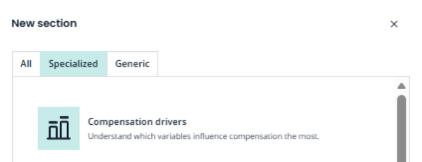 To add it, open any report and switch to Edit mode and click the plus icon to add a new section. The Section Library is displayed. Scroll until you find the Unadjusted Pay Gap option and then select it.
