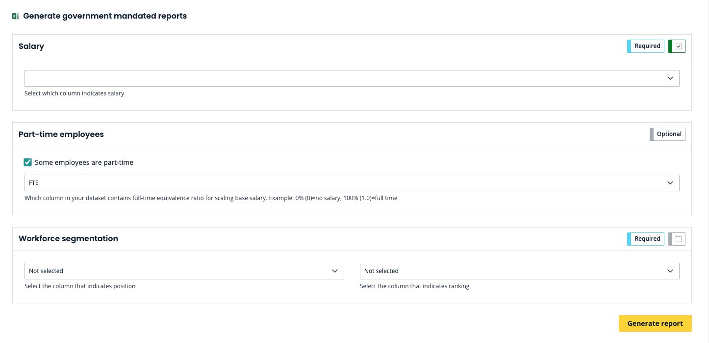 Une fois sélectionné, vous serez dirigé vers la page de configuration du rapport, où vous devrez sélectionner quelles colonnes de votre jeu de données indiquent le salaire, la valeur ETP des employés à temps partiel, comme illustré dans l'image suivante :