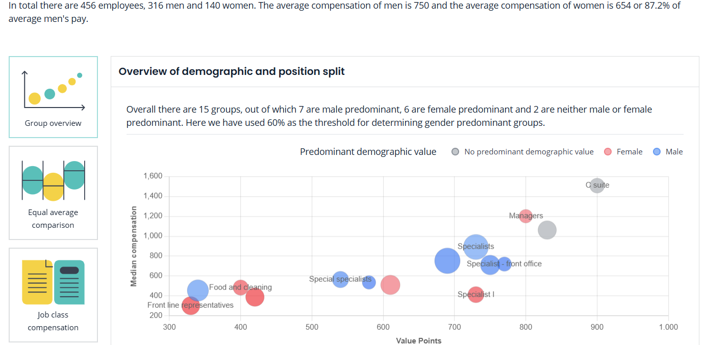 - La comparaison basée sur la valeur fournit des informations puissantes basées sur un principe fondamental de l'équité salariale : « Égalité de rémunération pour un travail de valeur similaire ou égale ». Une fois que vous avez complété et importé les résultats d'une évaluation des emplois, la fonctionnalité de comparaison basée sur la valeur vous permet d'approfondir les données pour révéler d'éventuelles iniquités, vérifier la conformité et planifier des ajustements si nécessaire. Dans PayAnalytics, vous pouvez créer et consulter ce rapport dans notre fonctionnalité de Comparaison basée sur la valeur, disponible dans la section Rapport de la navigation.